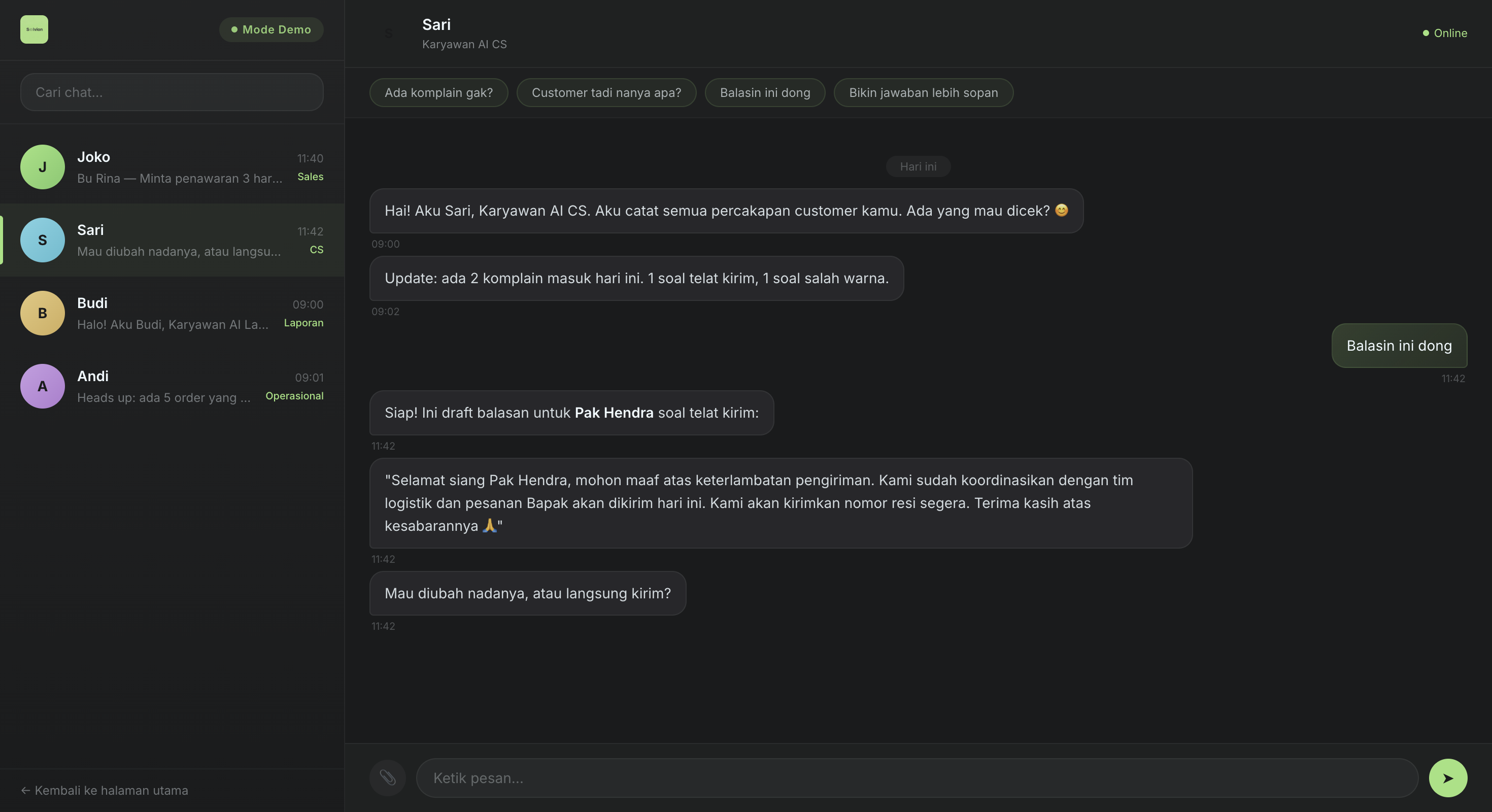 AI yang menjalankan follow-up, menjawab pertanyaan, dan membantu proses transaksi. Jika ada kondisi yang perlu manusia, sistem akan mengalihkan secara otomatis.